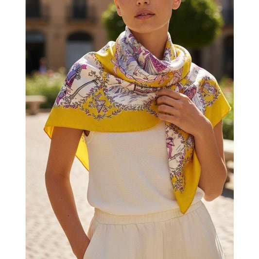 Vintage 1950s Silk Folk Song Scarf – 9 Scenes, Hand Rolled Yellow Hot Pink Print