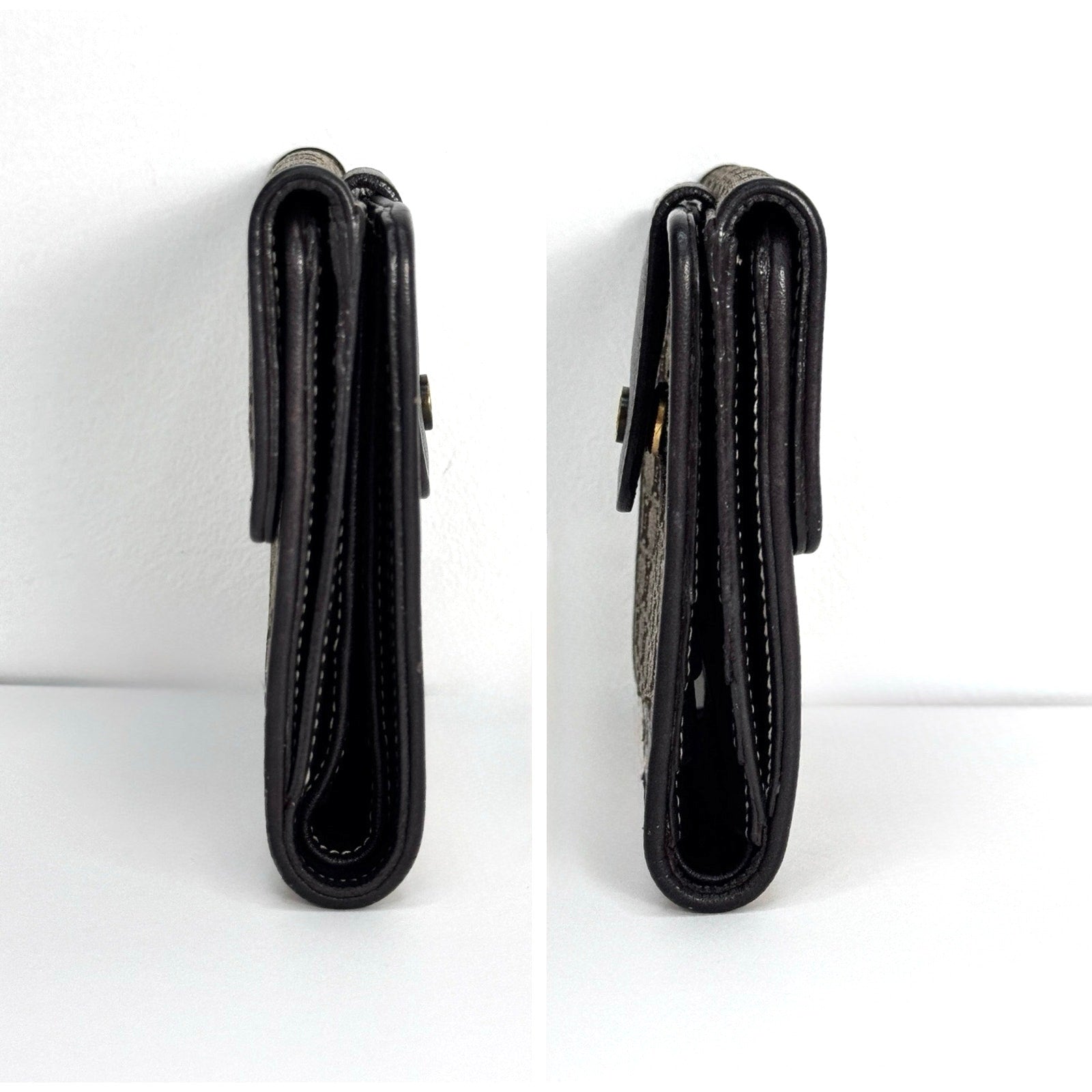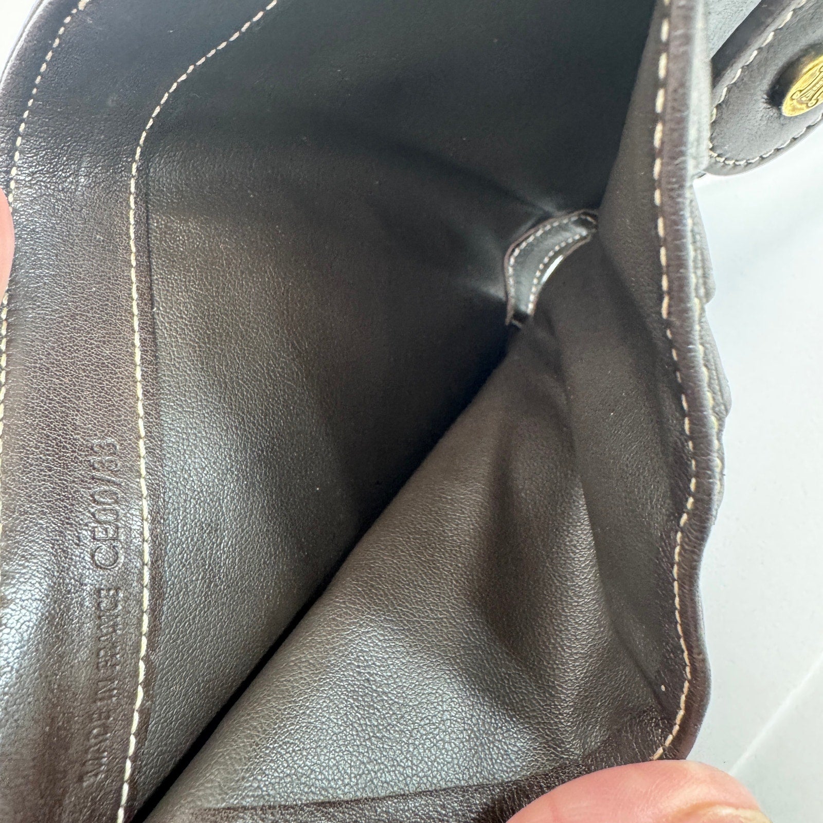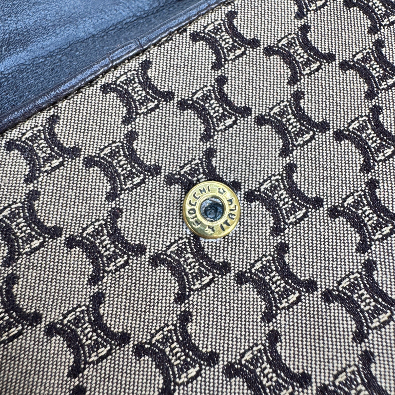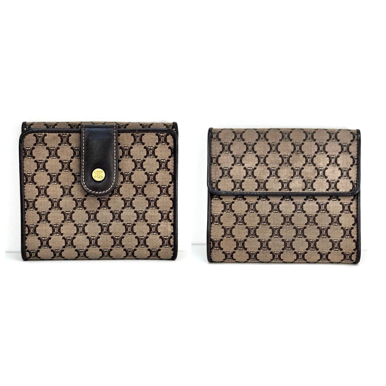 Vintage Celine wallet crafted in the iconic Triomphe Macadam canvas with smooth brown leather trim and gold-tone hardware. Features a coin holder on one side, while the opposite side opens to reveal a full cash pouch, six card slots, and two additional slip pockets for receipts or small documents.