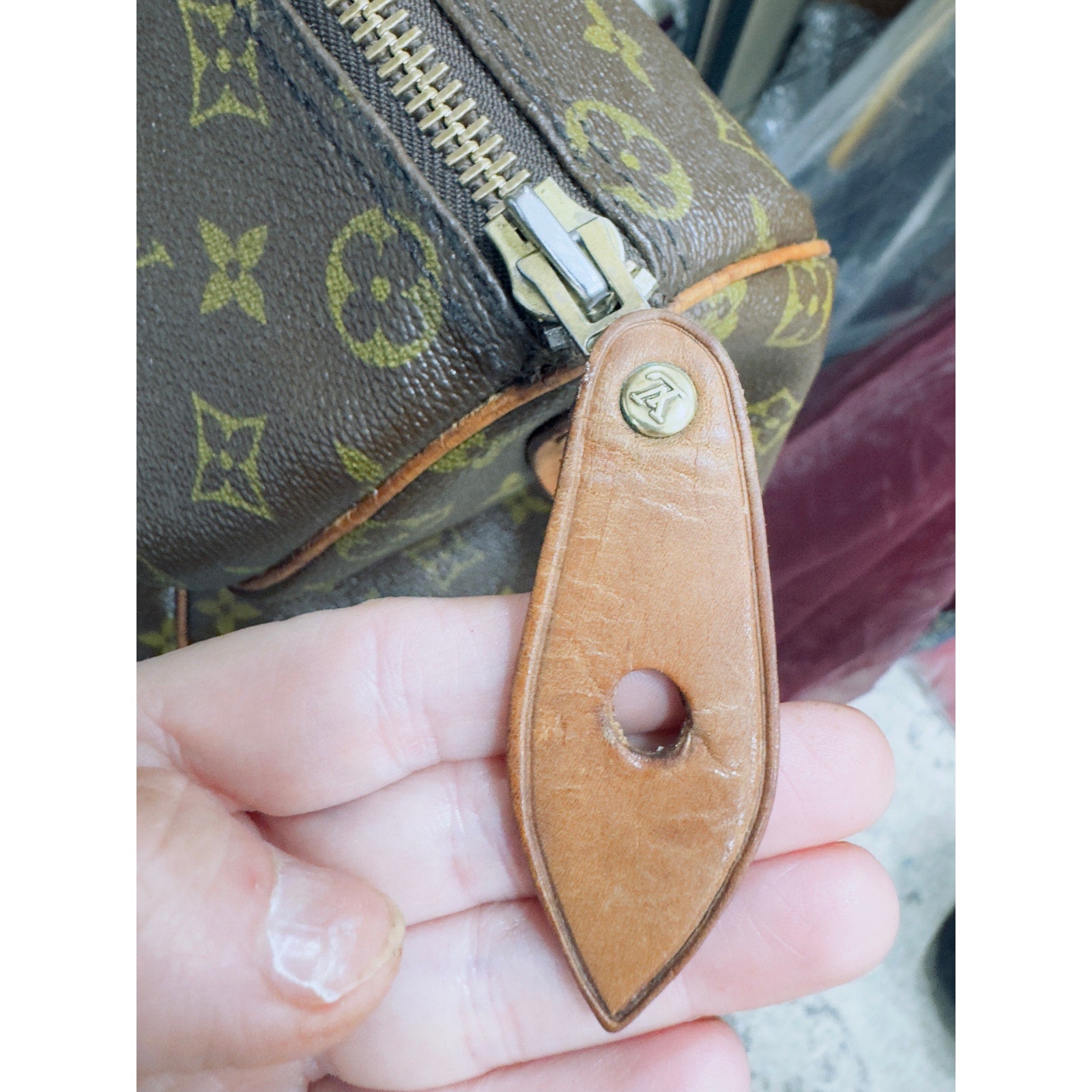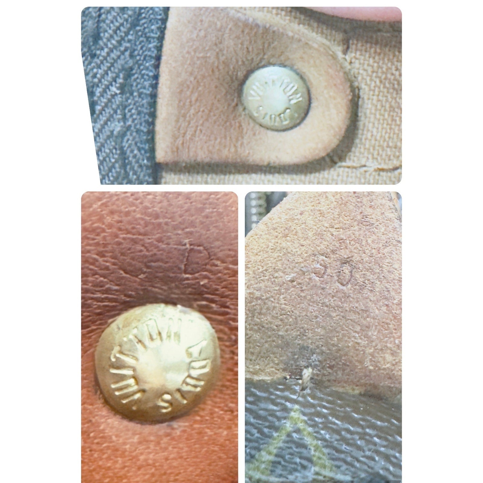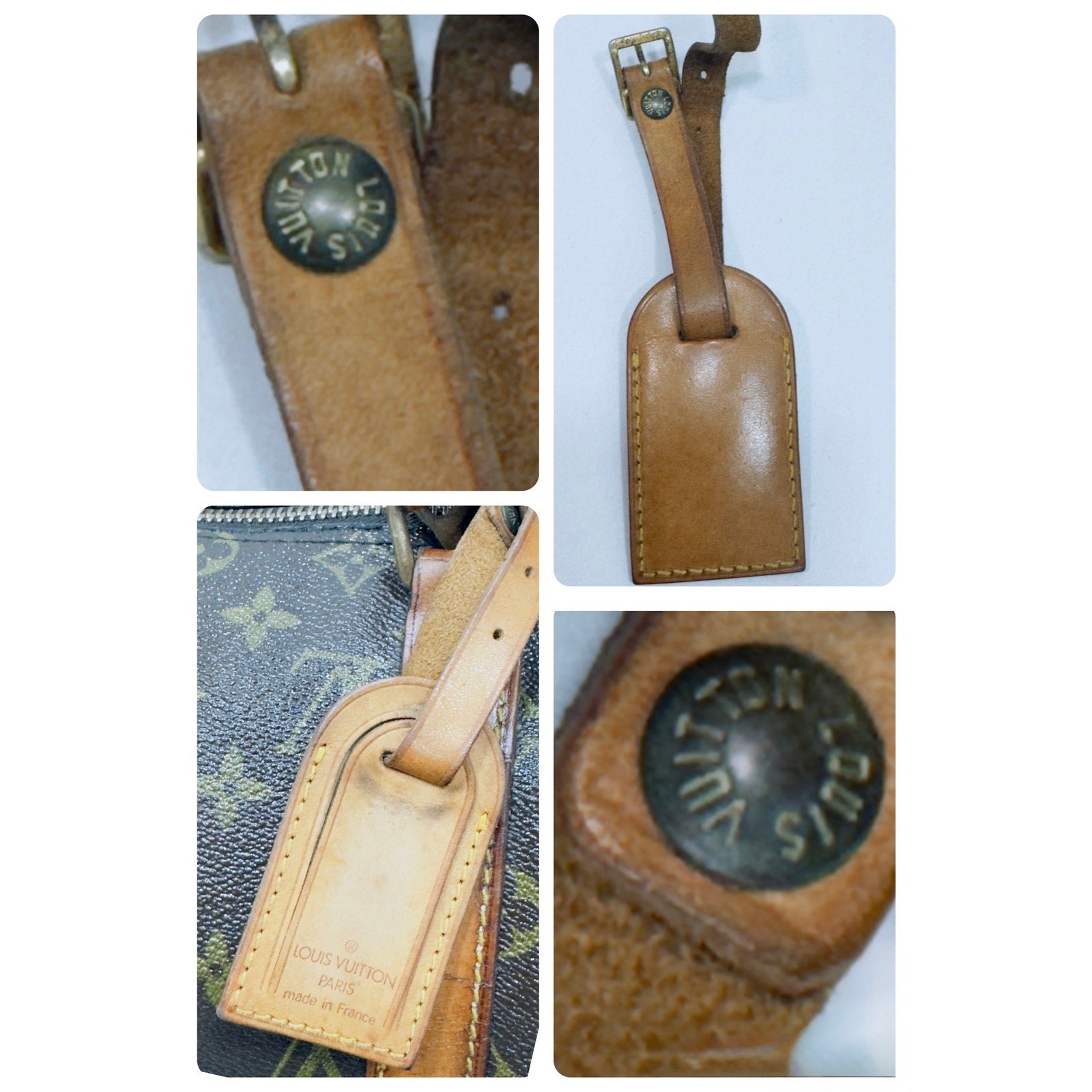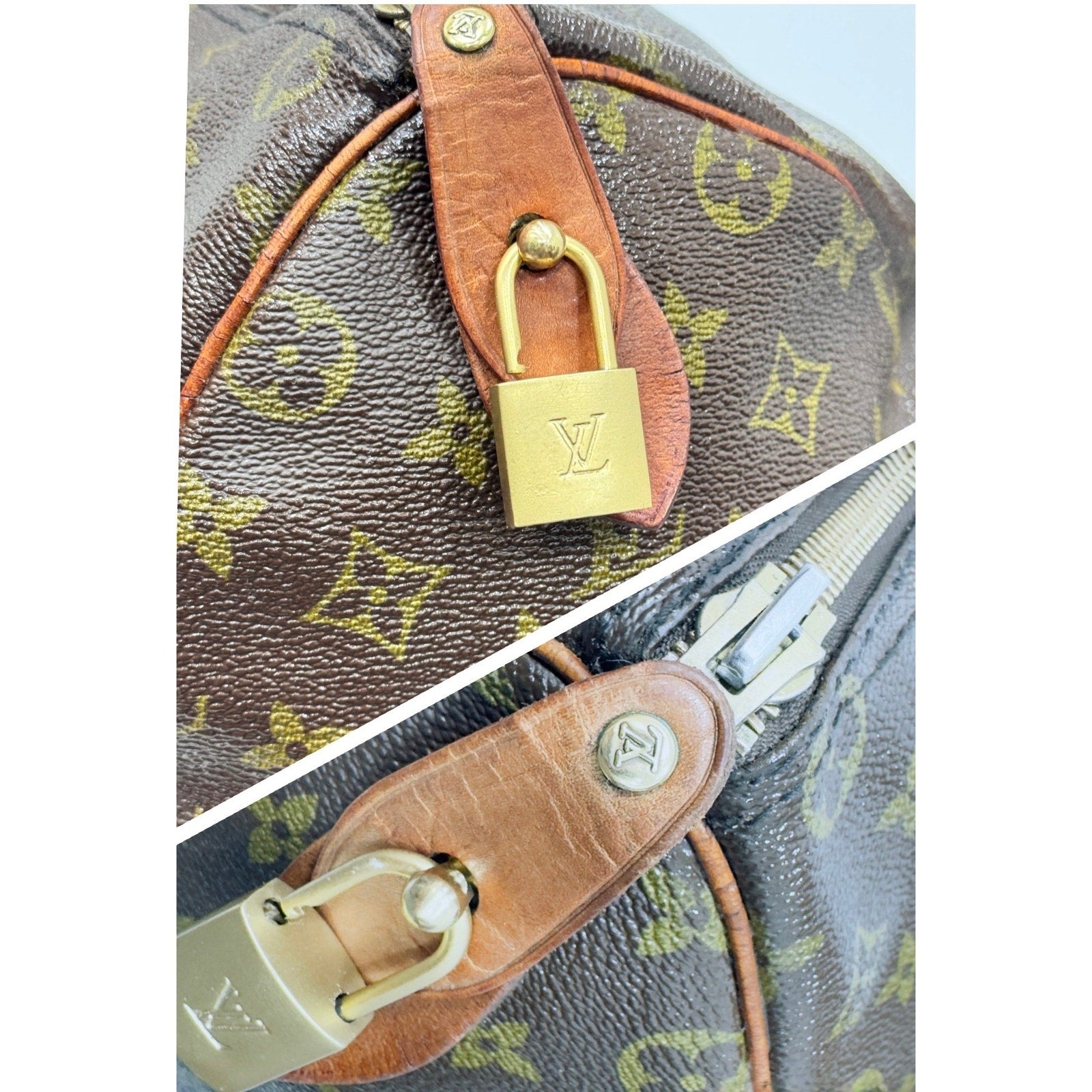 Exterior canvas remains strong, vibrant and beautiful with no cracks. Vachetta leather trim and handles show dark patina, Trim shows surface wear from age but has a gorgeous patina. Hardware tarnished with vintage oxidation, Zipper runs smoothly. Faint date code impression inside handle tab consistent with 1980s SD production. Lock, key and luggage tag included. Vachetta leather Tab Eclair Zipper pull with LV hardware. Zipper tape and zipper looks new, no holes, functions smooth and is completely intact with the bag no separation- but the threading looks to have been loose in some places or repaired on the interior but doesn’t at all affect function.