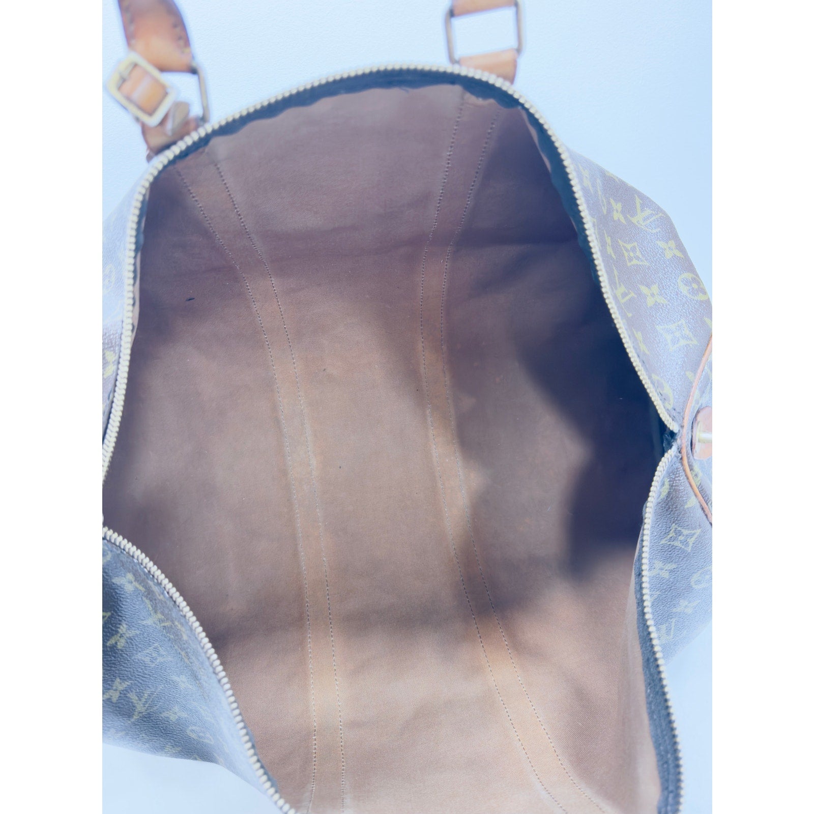 Rare Vintage Classic Louis Vuitton Keepall 50 in Monogram Canvas, vintage model with single Éclair zipper.. This is the pre-Bandoulière version (no strap rings) and features vachetta leather trim, dual rolled handles, and original LV lock with skeleton key. A collectible travel piece with iconic craftsmanship.