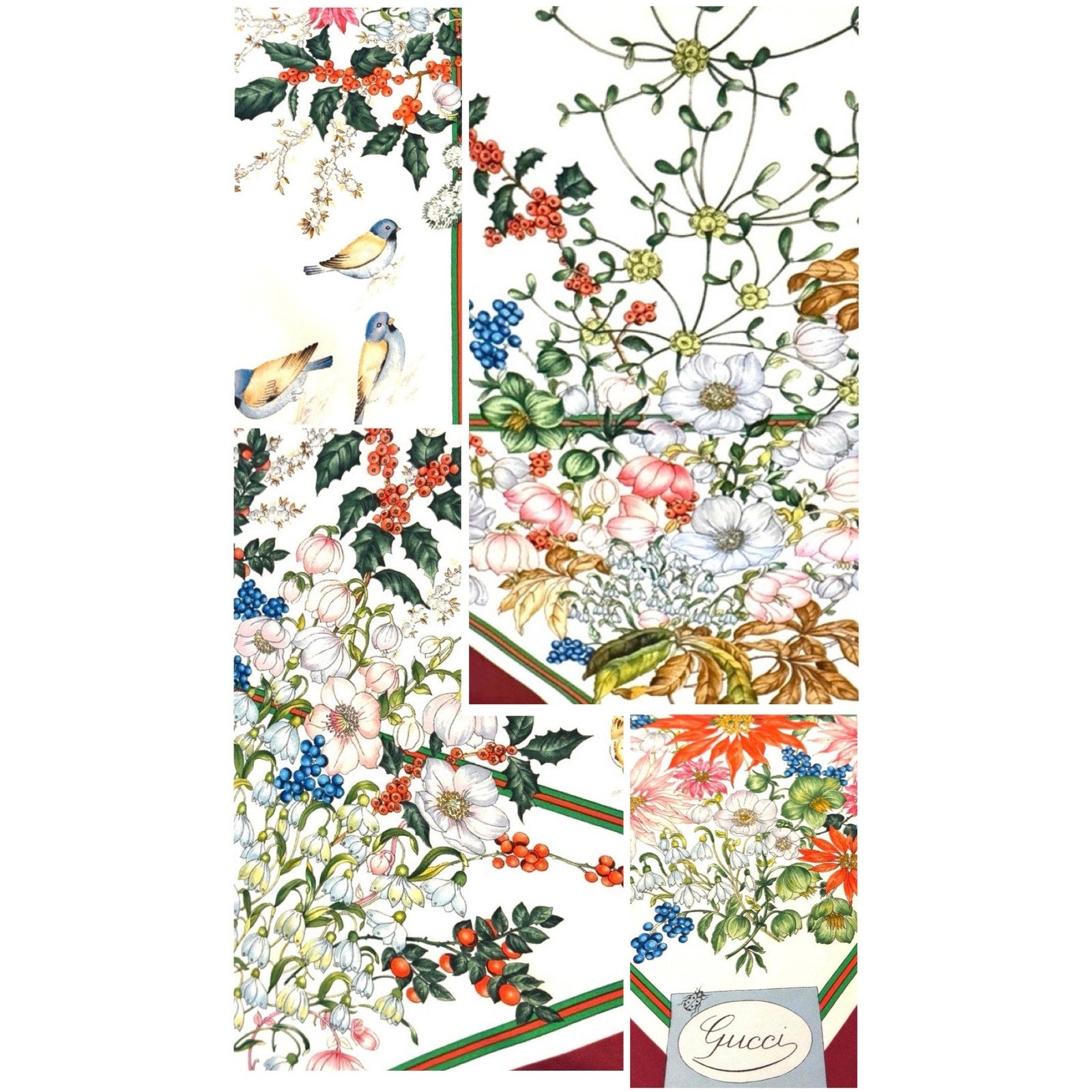 Rare Vintage Gucci Flora Silk Scarf – Burgundy Border, Birds, Rare Ladybug