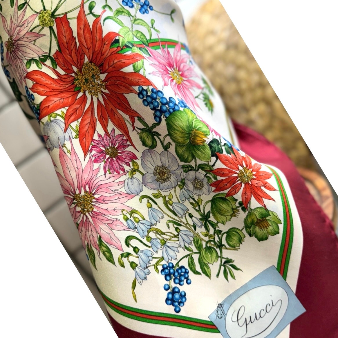 The standout rarity is the printed Gucci label panel, which includes an illustrated single ladybug—a charming and highly unusual detail virtually absent from online archives, sold listings, and collector references. Its deliberate integration into the artwork, combined with the older-style silk tag, strongly points to an early vintage production (likely late 1970s–1980s), predating the later widespread use of the Flora motif.