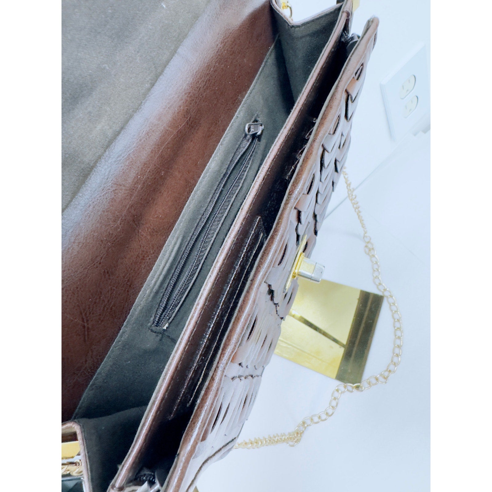 Hardware: Gold-tone; front turn-lock; rear snap; metal zippers